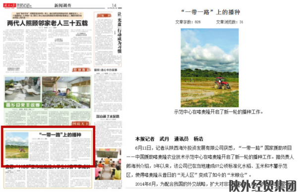 2017年6月15日,陕西日报以《“一带一路”上的播种》为题,对陕海投承接的援喀麦隆农业技术示范中心项目进行了专题报道,报道指出,通过三年的辛勤工作,示范中心已在当地建成67公顷标准化水稻、玉米和木薯示范区,使得喀麦隆从昔日的“无人区”变成了如今的“米粮仓”。