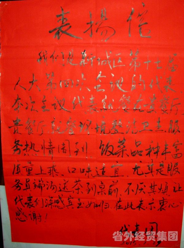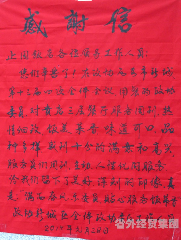 会议期间,饭店全体工作人员高度重视,精心准备,顺利接待参会代表及工作人员共计600余人,安排工作井然有序,服务态度周到细心,受到了新城区人大、政协会务组一直好评,并专程送来了感谢信。信中提到:饭店餐饮部全体员工服务周到、热情细致、饭菜可口、品种多样赢得了与会领导及广大委员、代表的广泛赞誉和高度评价。
